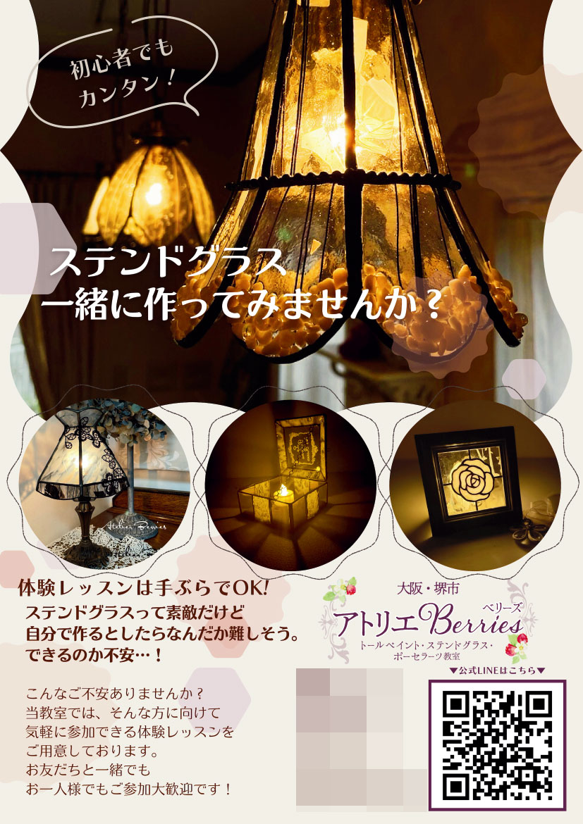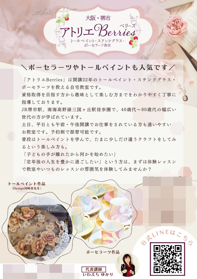 大阪府のトールペイント・ステンドグラス・ポーセラーツ教室・アトリエBerries様のフライヤーを制作させていただきました。
