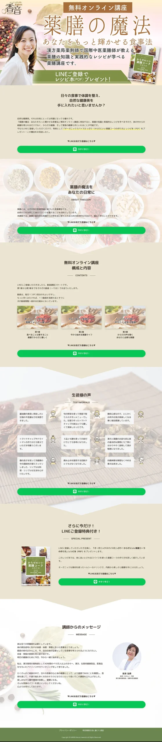 神奈川県の 国際中医薬膳師・漢⽅薬局管理薬剤師 岩本 治美様を「トータルプロデュース」いたしました。ホームページ作成から始まり、LP制作、無料オンライン講座用動画シナリオ作成、ステップLINE文章執筆、Meta広告出稿代行・設置など手掛けました。このたびはご依頼ありがとうございます。