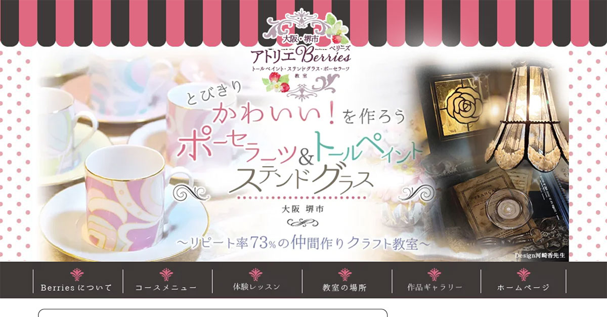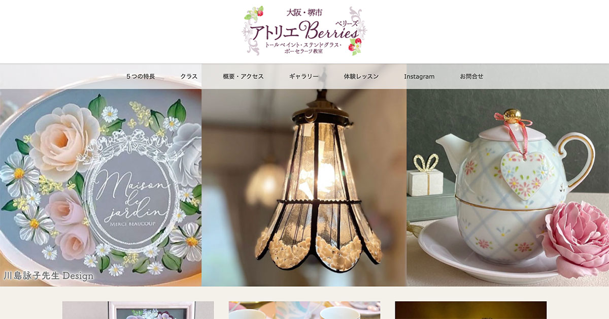 大阪府のトールペイント・ステンドグラス・ポーセラーツ教室・アトリエBerries様のホームページの改修、アメブロデザイン改修、およびLINEでのオンライン講座構築に携わらせていただきました。